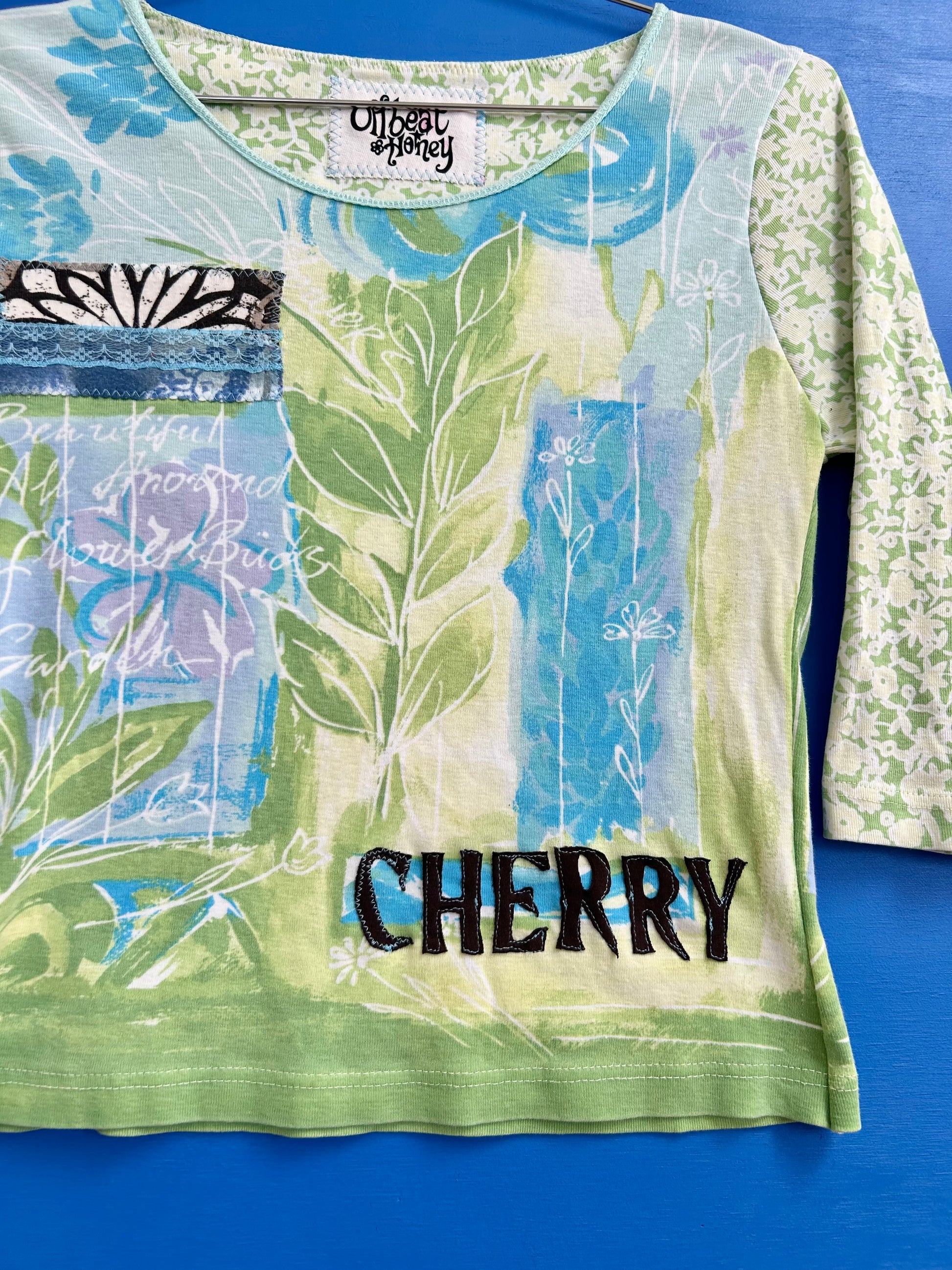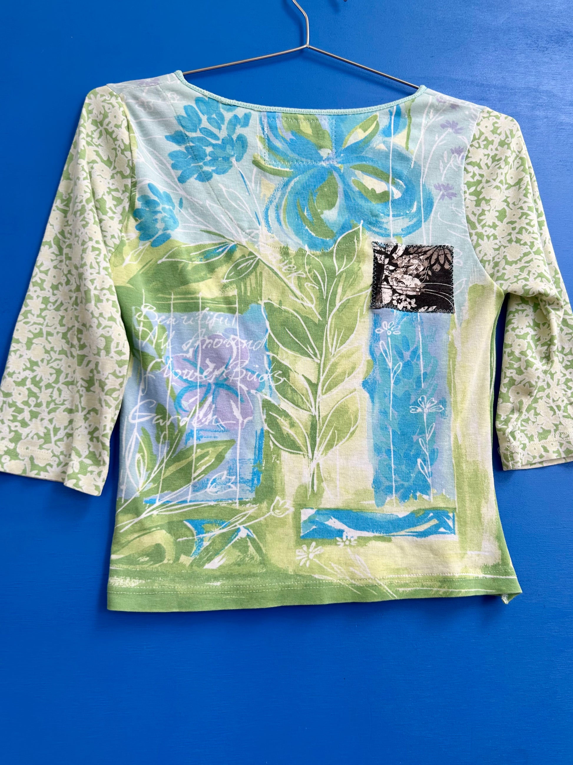 Fitted quarter-sleeved top made from y2k vintage patterned fabric.