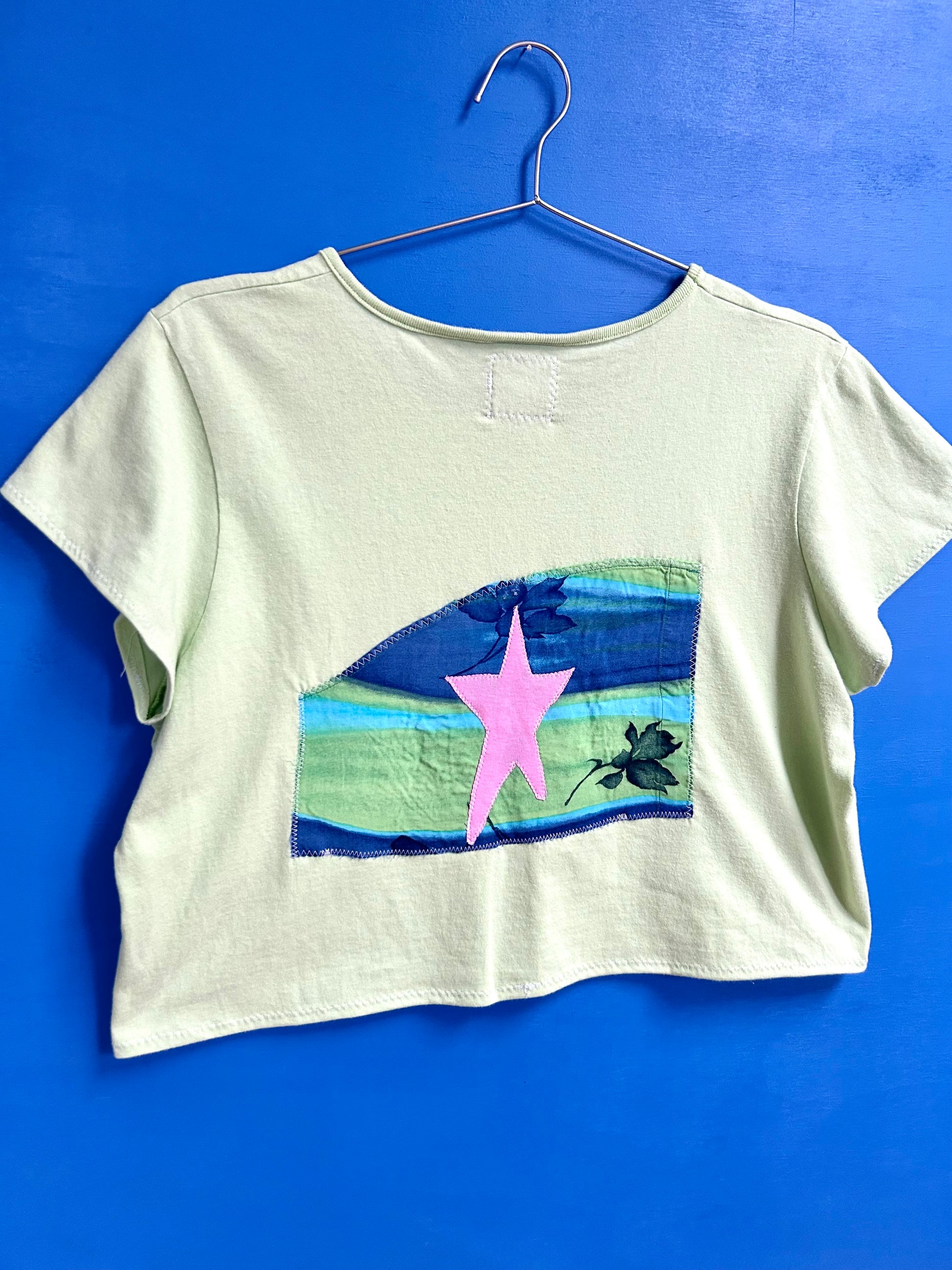 Vintage tee with flamingo design, honey patch sewn onto center.