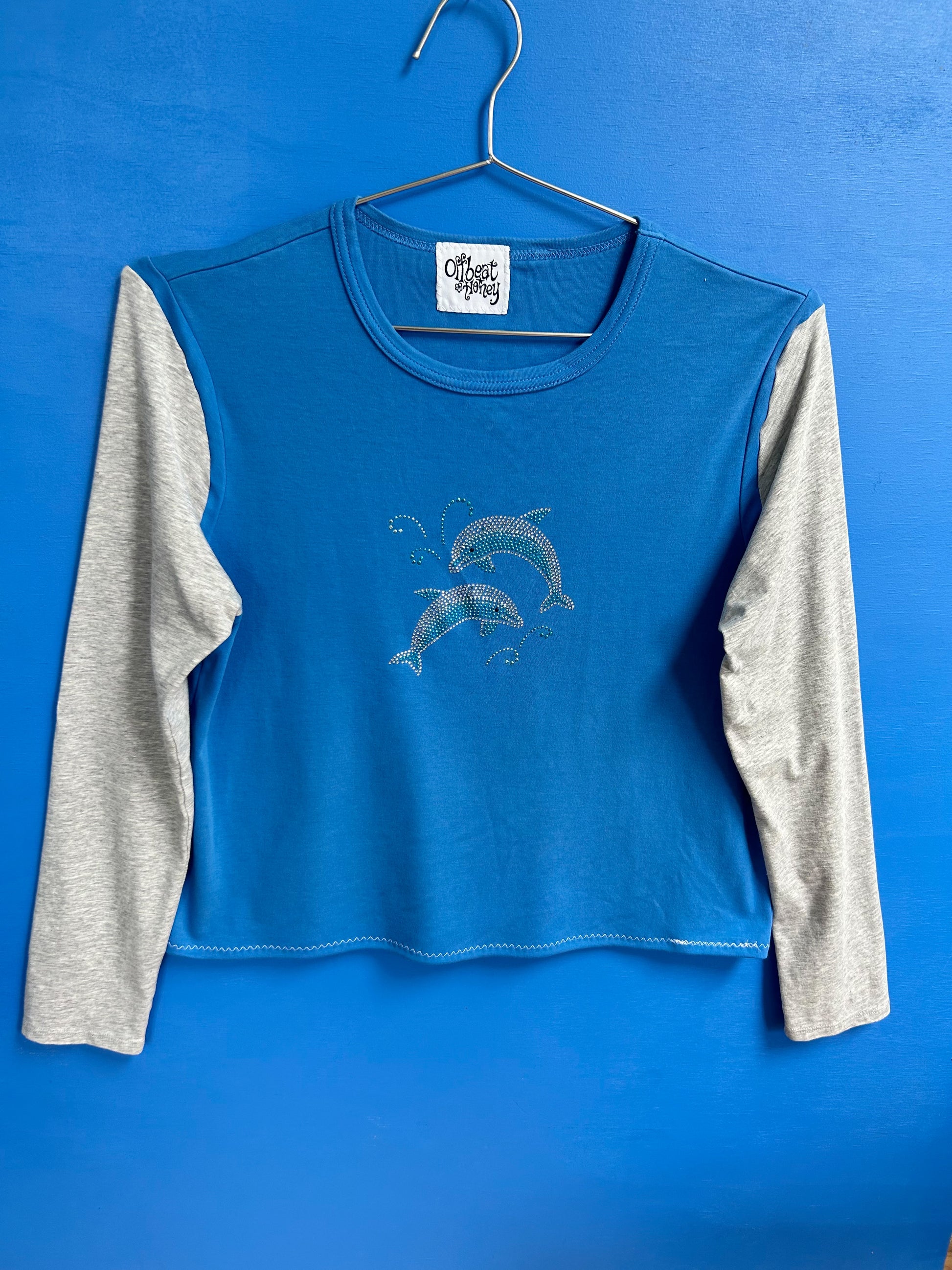 Re-worked vintage bedazzled dolphin shirt with colorblock sleeves from vintage grey sleeves.