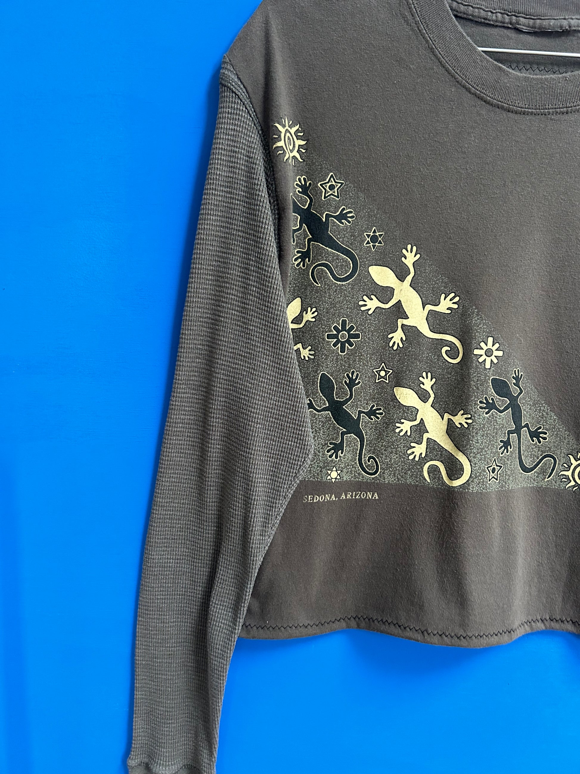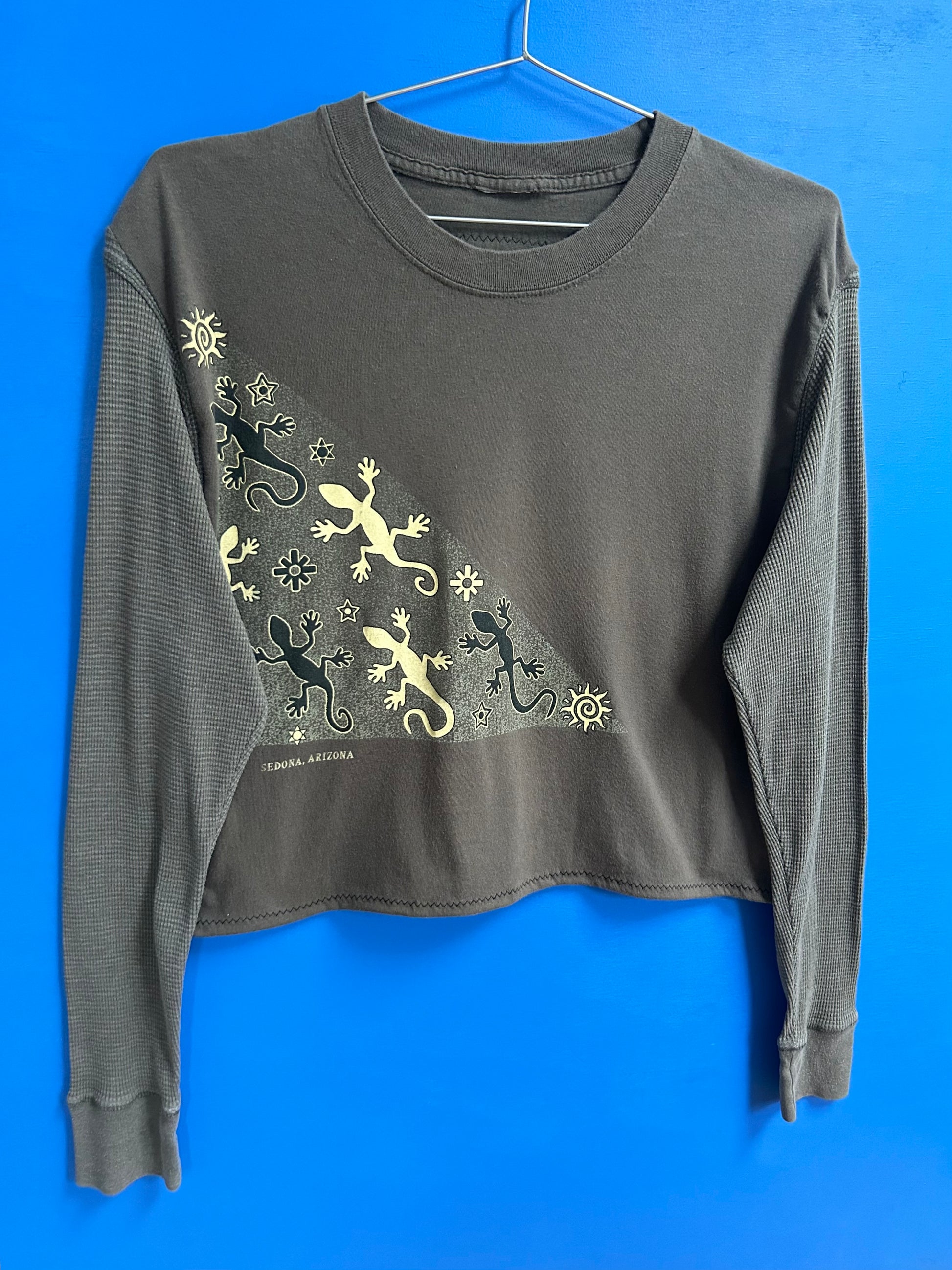 Re-worked vintage Sedona, Arizona shirt, colorblocked with waffle sleeves.