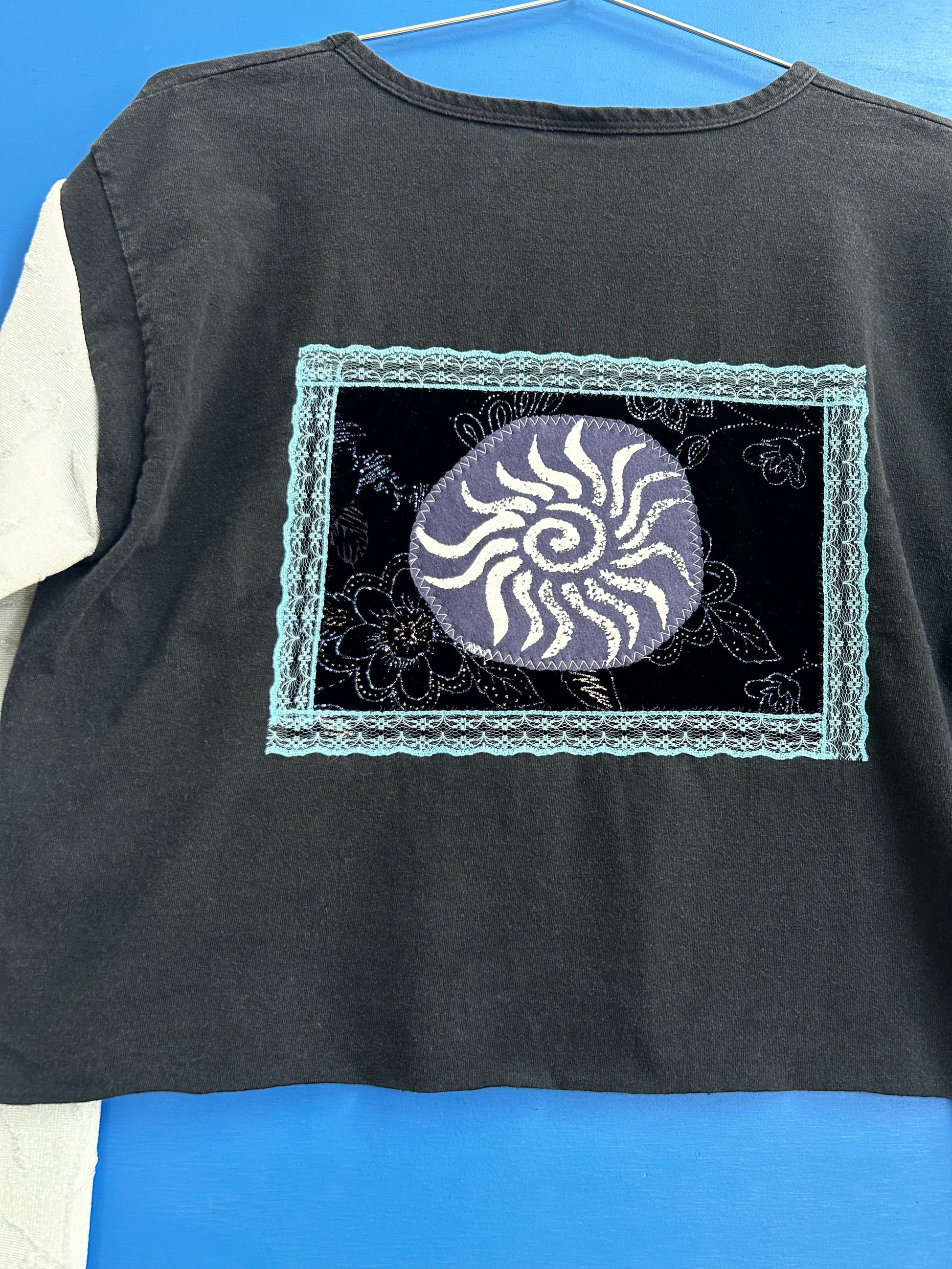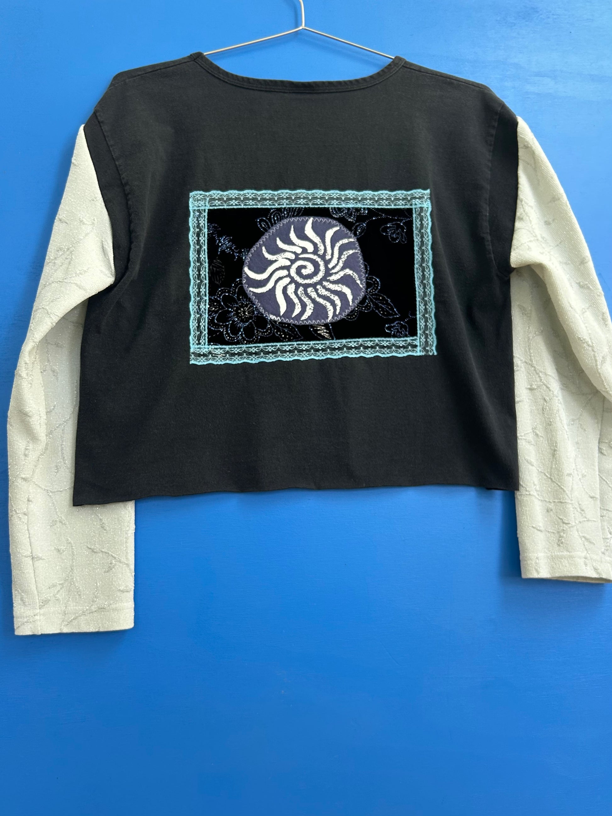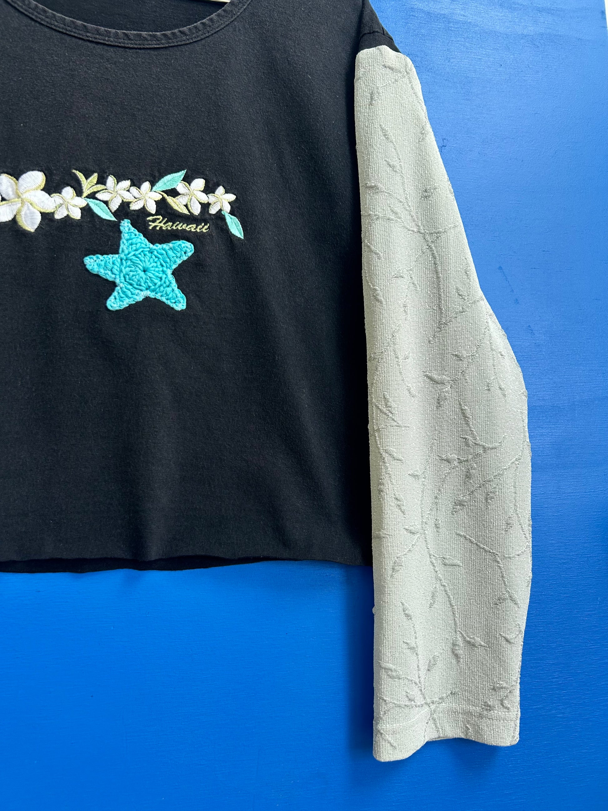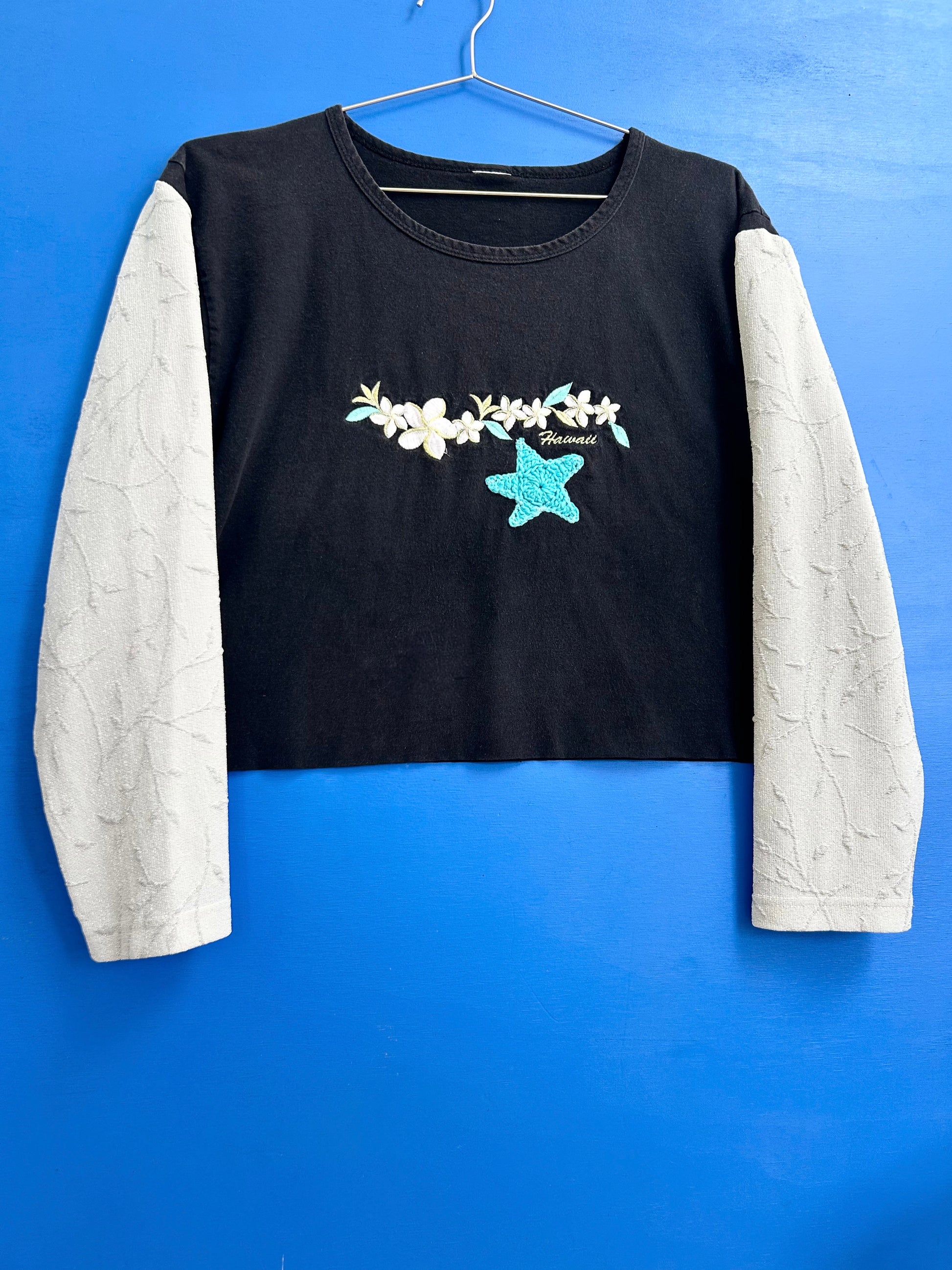 Re-worked vintage Hawaii shirt, color-blocked with silver sleeves with hint of sparkles. This was made from vintage shirt + vintage cardigan.