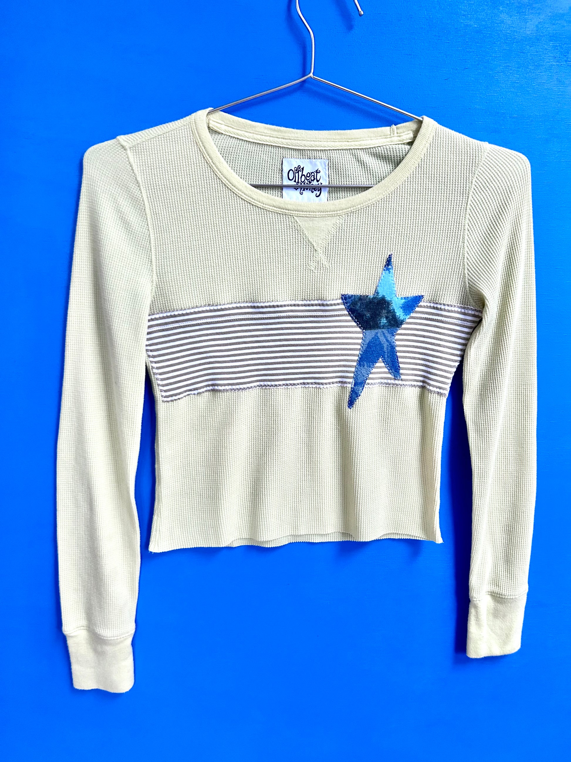 Vintage yellowish/green waffle long sleeve with striped patches sewn onto front and back.