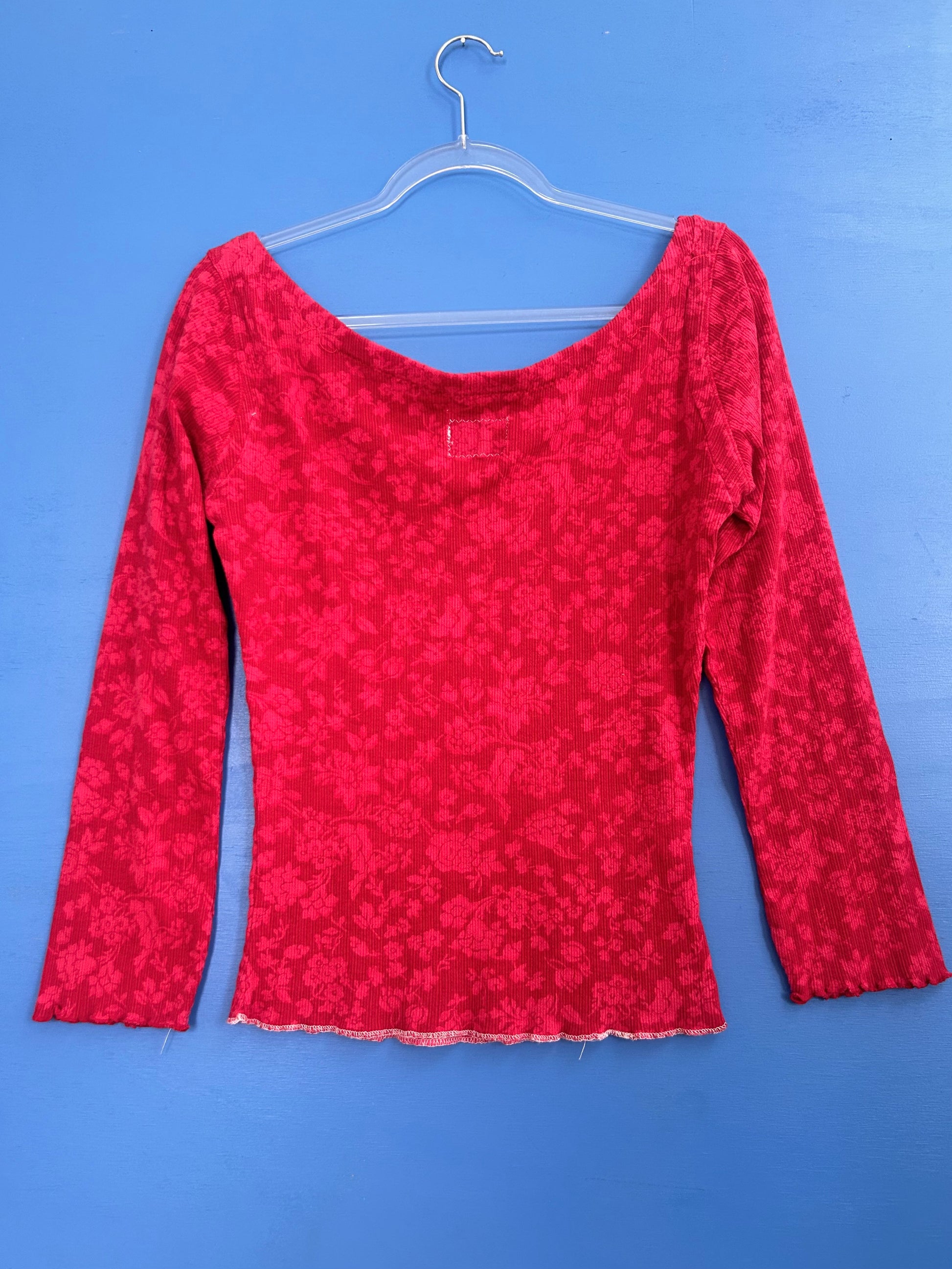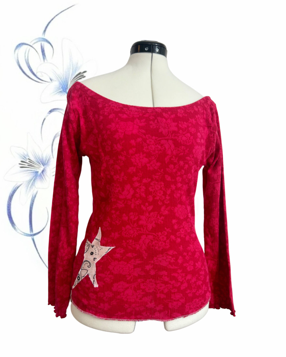 Bright red floral design. Stretch elastic along the neckline. Star patch made from recycled fabric.