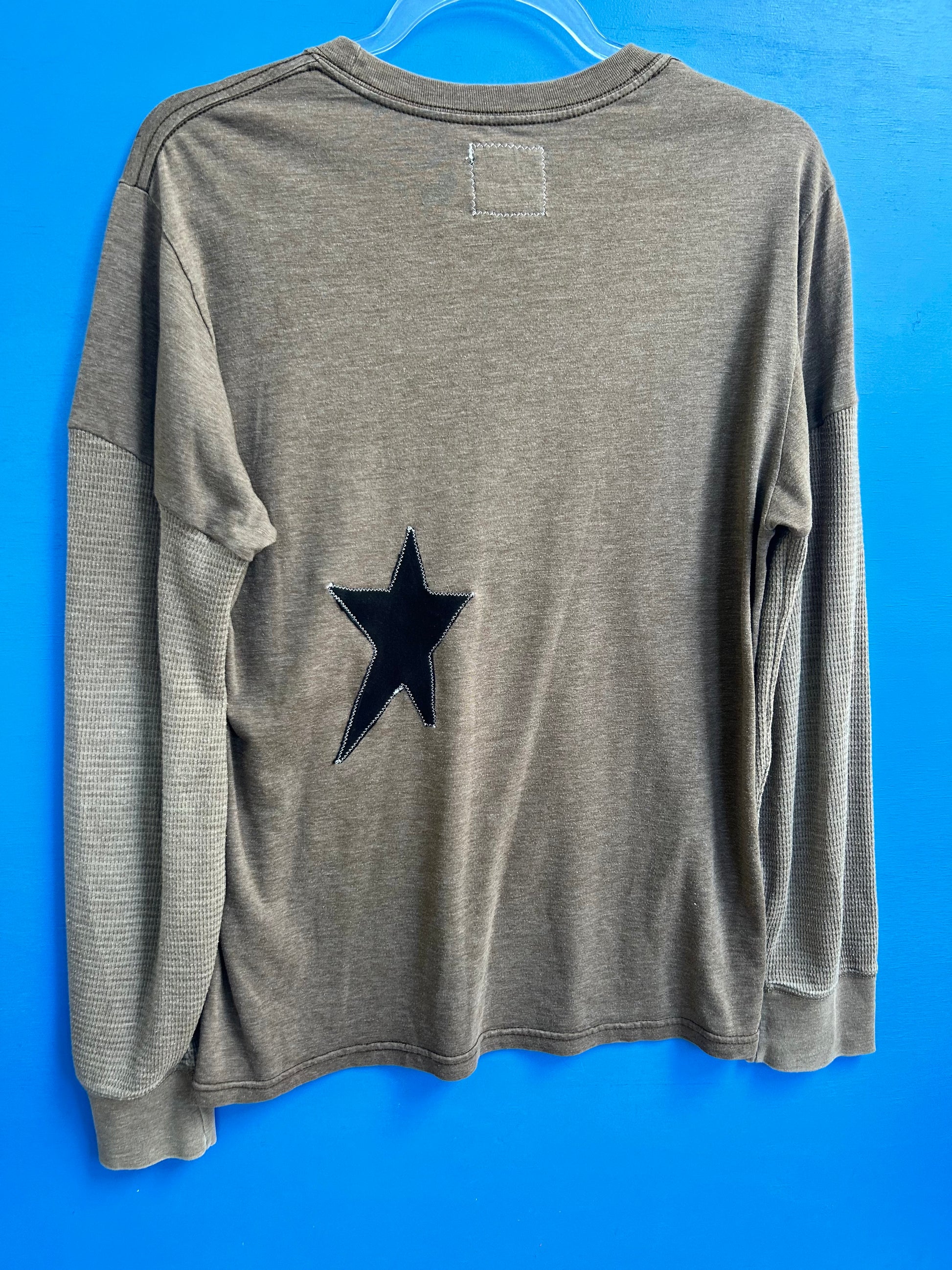 Black star patch sewn on back, made from recycled fabric.